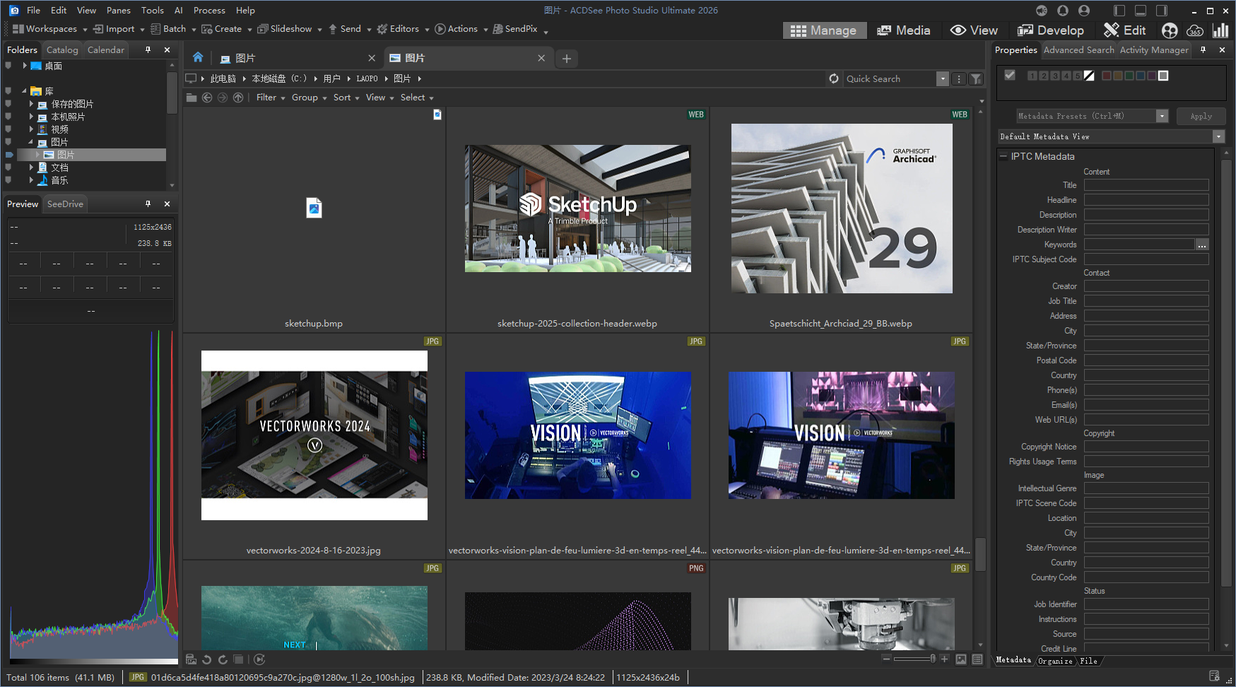 ACDSee Photo Studio Ultimate 2026 64位英文版已为下一代图像格式做好准备,支持以 JPEG XL(JXL)格式打开、编辑和保存文件。JPEG XL旨在实现数字图像存储和传输的现代化,与普通的旧 JPEG 相比,它为摄影和数字艺术提供了更高的效率和质量。通过增加对 JPEG XL(JXL)和AVIF格式的IPTC元数据支持,扩大您的编辑和元数据选项;新的和流行的相机型号已添加到支持的RAW文件类型中。