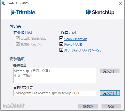 2、从上图我们看到,Sketchup Pro 2026 v26.0.429 64位位多国语言版软件默认安装路径为C:\ProgramFiles\SketchUp\SketchUp 2025,我们根据上图提示,知识兔点击“安装”开始安装软件,如下图所示: