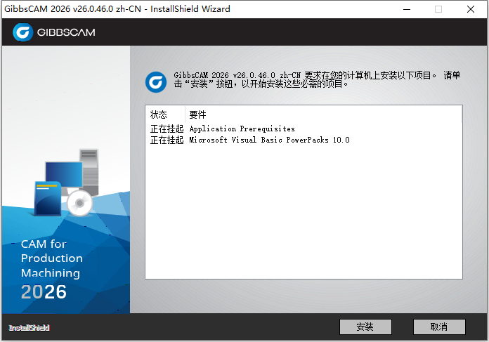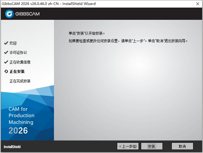 6、我们根据上图提示,知识兔点击“安装”开始安装GIBBSCAM 2026 v26.0.46 64位简体中文版软件,如下图所示: