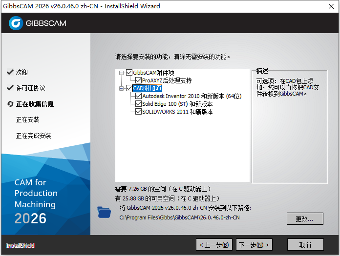 5、从上图我们可以看到,软件默认安装路径为C:\Program Files\CAMBRIO\GibbsCAM\26.0.46.0-zh-CN,我们根据上图提示,知识兔点击“下一步”,如下图所示:
