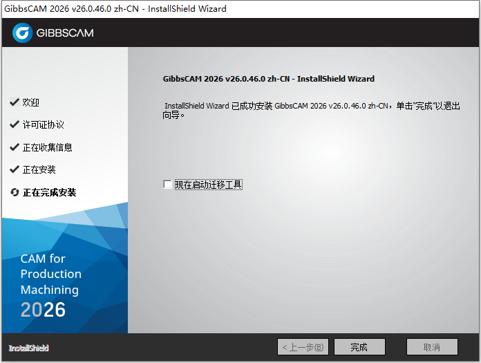 8、从上图我们看到,GIBBSCAM 2026 v26.0.46 64位简体中文版软件已经顺利安装完成,我们根据上图提示,知识兔点击“完成”即可。